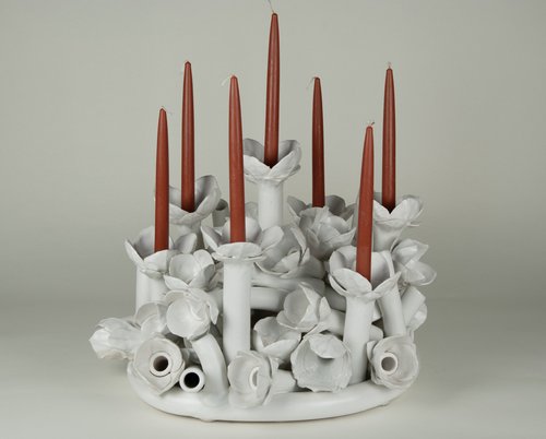 Porcelain, matt glaze, floral centerpiece, 16"W x 16" Dx 16"H, 2013.